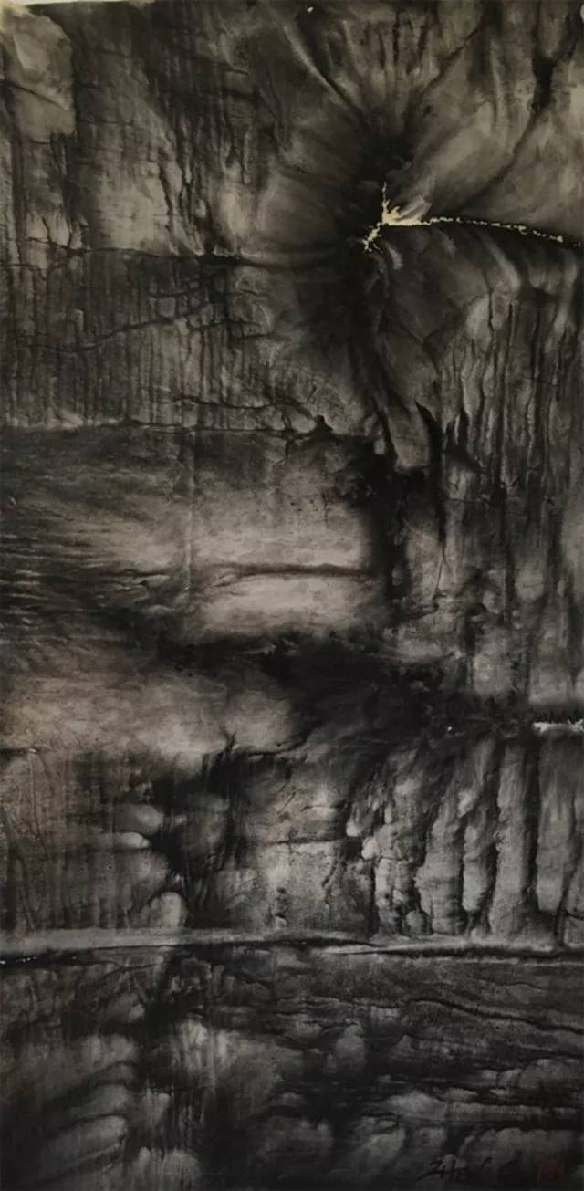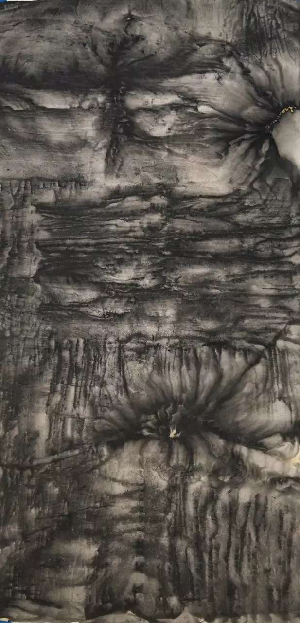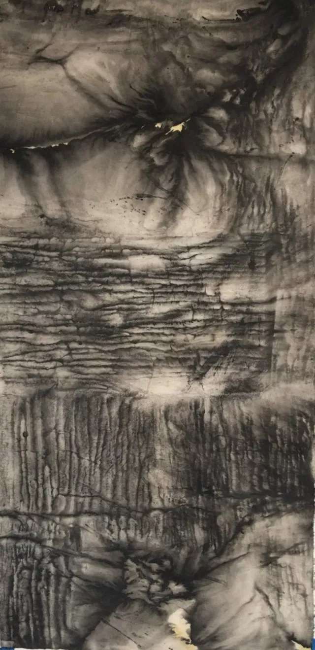 郭祯是来自美国的女艺术家,居住纽约几十年了。她早年毕业于中国美术学院国画系,八十年代国美是水墨实验艺术的先锋场地,郭祯和其他艺术家一起,都投入了这场风潮,之后“八五新潮”过去,移居西方,她骨子里的水墨情结却未消失,而在一个大的中西方文化背景的比较下,她更意识到了作为一个中国人的文化选择和本能表达,于是抽象水墨便成了她的选择。在她的作品中,随意晕染开来的墨迹,如同深浅不一的情绪,四泄而开,如同内心的隐秘地图,千沟万壑,起伏连绵,只有自己能走到。水和墨在交融那一刻产生的变化,充满偶然性,这也是她寻求的效果。当观众在一种对水墨画的惯性期待下突然看到这种没有具体内容的画面,思维模式受到了挫折,“看山不是山”,正是她追寻的哲学境界。