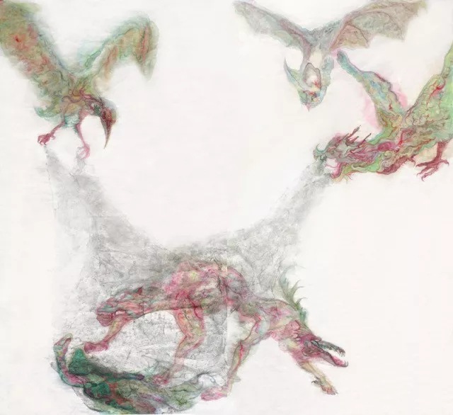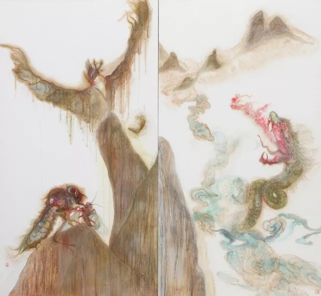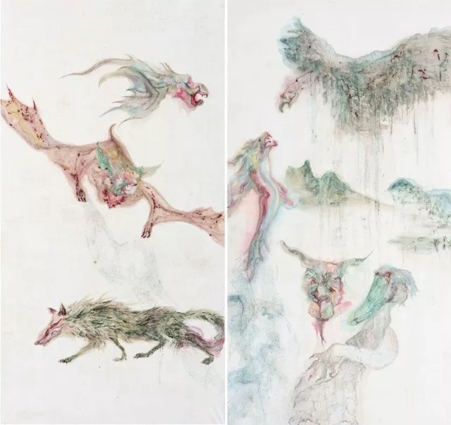 王艾茵毕业于中央美术学院国画系,来云南工作已经十多年了,在她的作品中,精灵古怪的各种生物像梦魇一样缠绕着人,它们有或明或暗的出处,有些来自古传说《山海经》,有些来自历代神话故事,有些纯粹出于她自己的想象。这个日常中温言细语的女子,用自己的画笔创造了一个迴异于其它的疯狂世界,在这个世界中,这些奇诡的生物无一不带着残酷的表情和鲜艳刺目的色彩,它们莫名其妙的存在也是她内心情绪的一种宣泄。而传统花鸟画的技法和表现内容也在她这儿有了新的阐释。