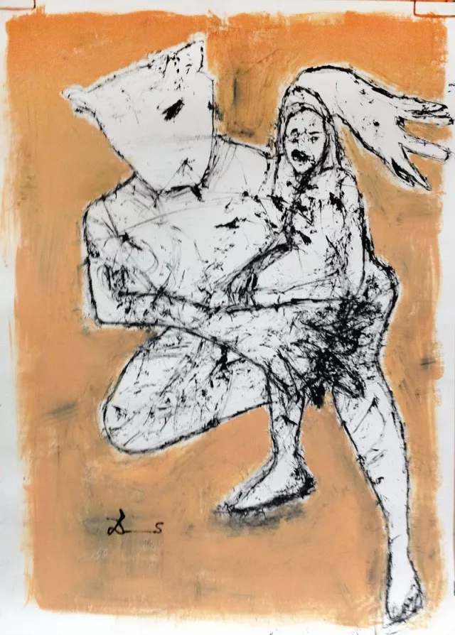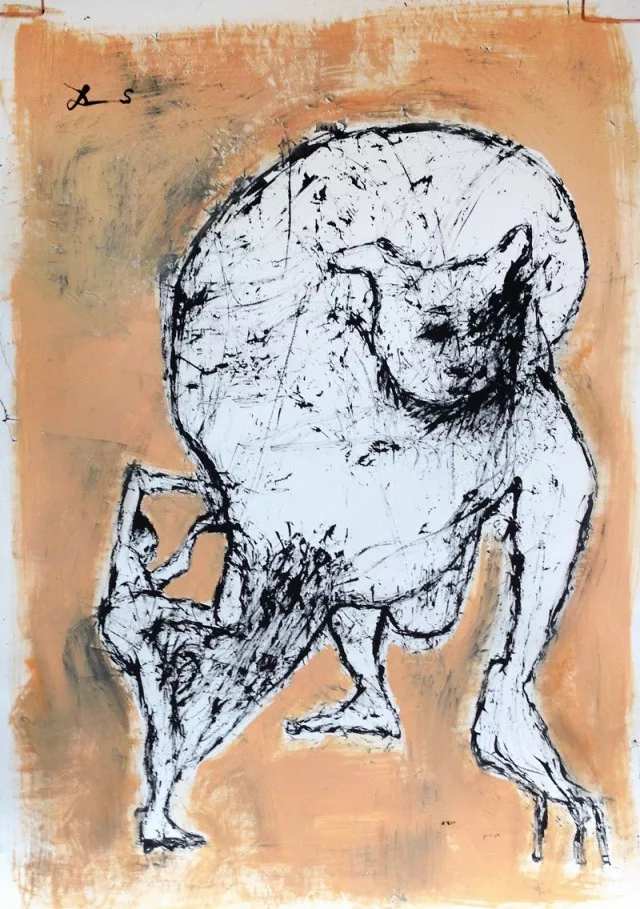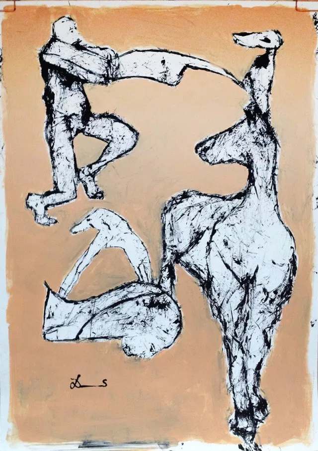 勒缇霞·杜香以前曾在巴黎大学攻读过艺术史和摄影,然而多年以后,她却发觉,硬材料雕塑和绘画才是她的最爱。她喜爱用石头打磨一个雕塑,或是用铁片编织造型奇怪的形,这些形介于物体和生物之间,但是雕塑创作受条件限制很大,直到有一天,她用树枝沾着墨汁开始在纸上作画,立刻,一个新的世界就被打开了。她曾经和一个亚洲艺术家在一起生活过,东方文化令她着迷,东方人对纸张和墨的敏感也传染了她,她用随意采来的树枝,蘸着墨汁在纸上塑造震颤的线条和形,然后又用类似古岩画的颜色来限制这些形,于是画面上便形成了个人性的图像,它们充满了现代的原始感,也有她个人的生命密码。