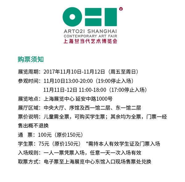参观时间: 11月10日 13:00-20:00(19:00停止入场)11月11日-12日 11:00-18:00(17:00停止入场) *1人1票,活动期间任意一天,一次入场有效; *儿童需全票,可购买学生票,需持本人有效学生证及门票入场;其余均为全票。