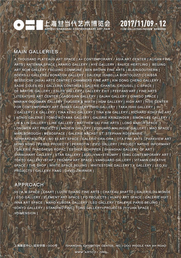 ART021上海廿一当代艺术博览会今日隆重宣布2017年参展画廊名单。适逢五周年之际,上海廿一当代艺术博览会(下称博览会)将于11月8日至12日再次于上海展览中心举行。作为国家艺术基金资助项目、第十九届中国上海国际艺术节参展项目、静安区文化发展专项资金补助项目,本年度博览会将汇聚来自全球5大洲、11个国家、27个城市,共计102家顶级画廊。