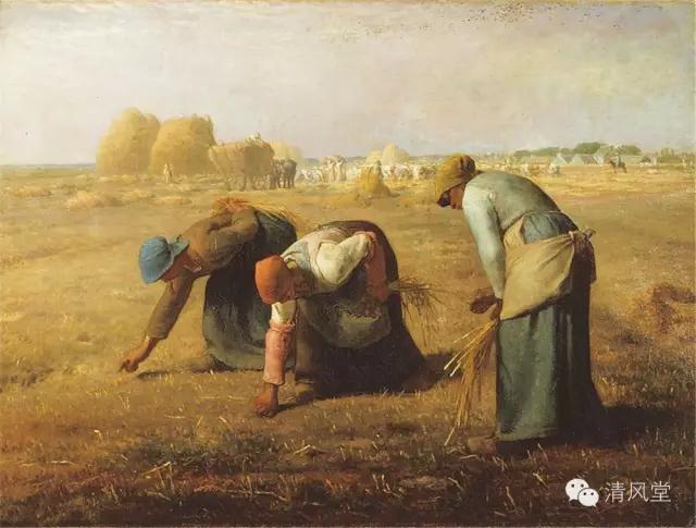 他在《拾穗》之中初次使用写实主义的手法,描写了一个农村中最普通的情景:秋天,金黄色的田野看上去一望无际,麦收后的土地上,有三个农妇正弯着身子十分细心地拾取遗落的麦穗,以补充家中的食物。她们身后那堆得像小山似的麦垛,似乎和她们毫不相关。我们虽然看不清这三个农妇的相貌及脸部的表情,但米勒却将她们的身姿描绘有古典雕刻一般庄重的美。三个农妇的动作,略有角度的不同,又有动作连环的美,好像是一个农妇拾穗动作分解图。扎红色头巾的农妇正快速的拾着,另一只手握着麦穗的袋子里那一大束,看得出她已经捡了一会了,袋子里小有收获;扎蓝头巾的妇女已经被不断重复的一上一下弯腰动作累坏了,她显得疲惫不堪,将左手撑在腰后,来支撑身体的力量;画右边的妇女,侧脸半弯着腰,手里捏着一束麦子,正仔细巡视那已经拾过一遍的麦地,看是否有漏捡的麦穗。
