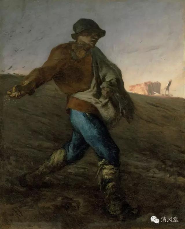 米勒从来没有画过农民反抗的场面,这也许是由于他的温厚的人道精神中含有宗教情绪的缘故。但他画的胼手胝足,粗衣陋食的劳动者的形象,实际上对纸醉金迷,灯红酒绿的上流社会就是一种抗争,虽然这种抗争是较温和的。这幅《播种者》即是如此。