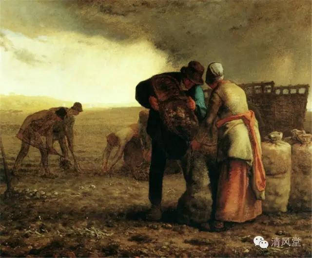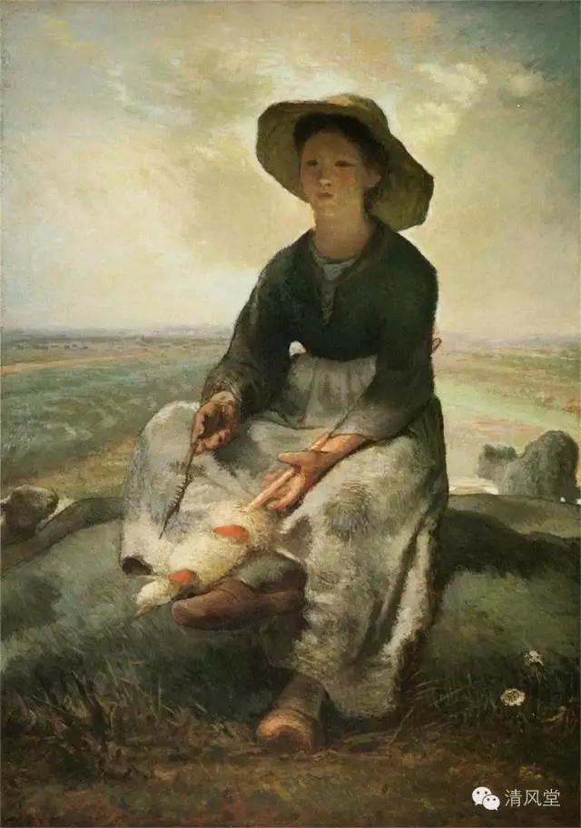 米勒生长于诺曼第的农场,这幅画是他在35岁左右以前尚找不到艺术方向的苦斗时代之代表作。他讨厌巴黎疯狂似的气氛及噪音,1849 年在巴比仲的小树装庄找到他的憩息之地他在此地碰到了狄奥多尔·卢梭,并结为知交。这个时期对米勒而言成为幸福的时期。