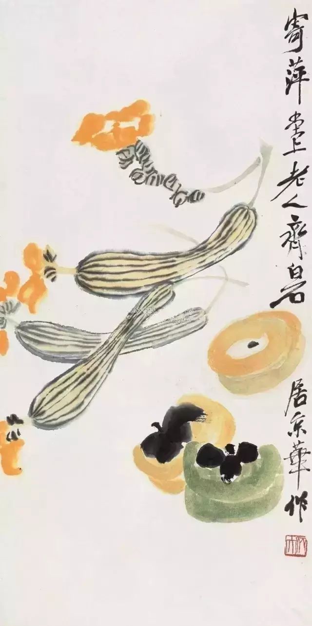 在齐白石众多的绘画题材中,蔬果类作品是最能触及老人思乡情结的一类,他将这些日常所见之物,寄予了深层精神内涵,超越了绘画的内容和形式。齐白石最爱画的各种蔬菜,都是他从小就吃过、种过的东西,牵系着他的儿时记忆与乡思。顺便一提,这不是小长假结束了嘛,知道你们不开心,这不是让你们赏心悦目来了吗?