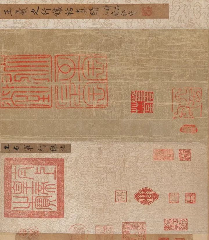 王羲之《行穰帖》,原迹已失传。此为初唐时期的双钩填墨摹本,硬黄纸本,24.4×8.9cm。二行,十五字,由北宋徽宗金泥题签和宣和之印,从南宋到晚明之间这个帖子曾一度与组织失去联系,直到为董其昌友人吴廷所藏,才重见天日。董其昌极其欣赏此帖,在后面题跋:“东坡所谓’君家两行十三字,气压邺侯三万签’者,此帖是耶?”