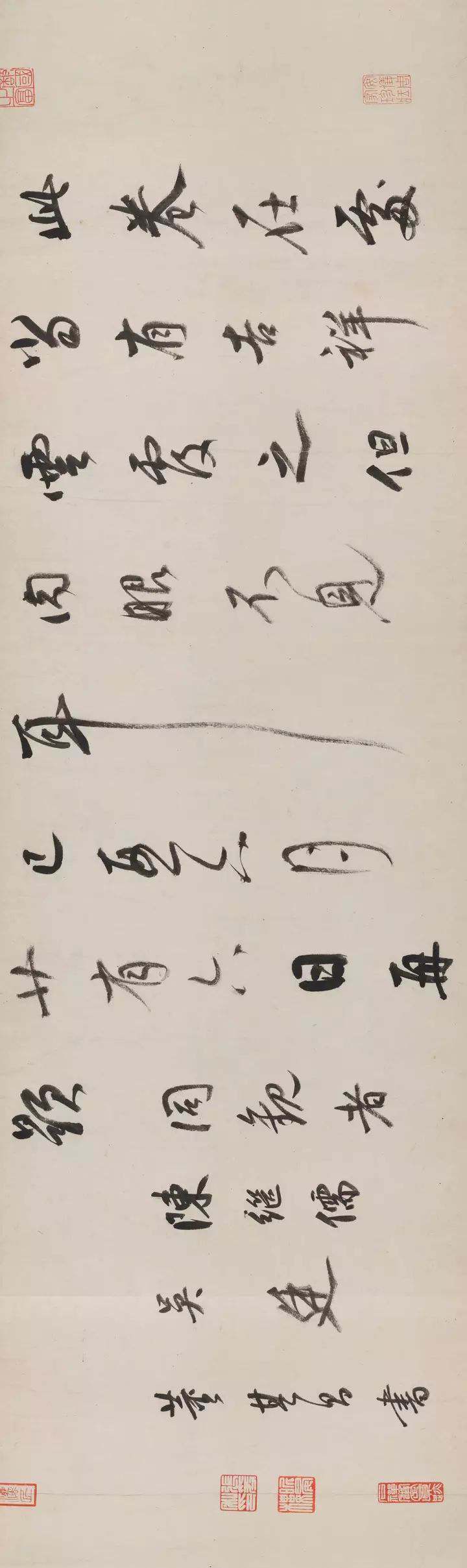 董其昌的题跋也是一大看点,本卷董其昌共有四段跋语,其中较长的有两段,分别以小字与大字书写,最重要和引人注目的是写于1609年的十一行行书,他的书法清俊劲健,用笔既谨严有度,又潇洒闲逸。墨色由浓至淡,由湿至枯。