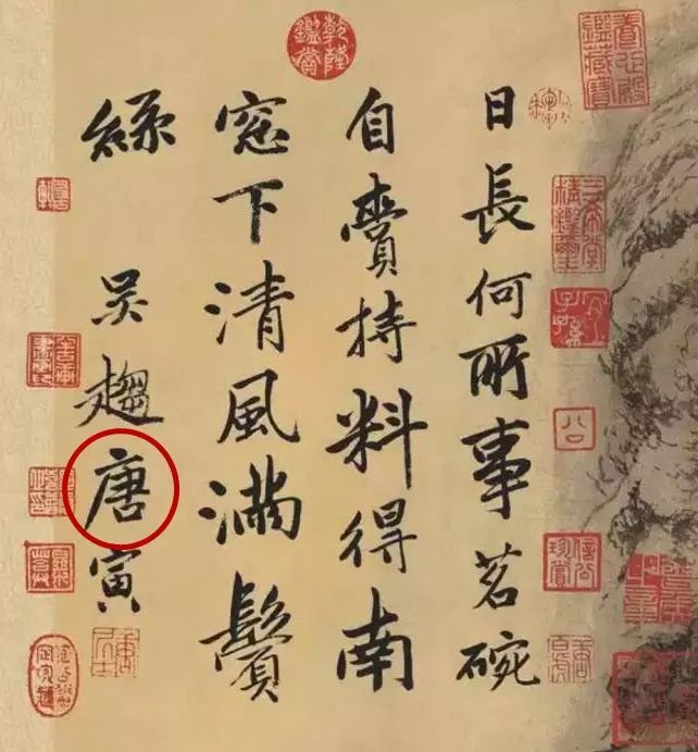 唐寅(唐伯虎)的署名,“唐”字多是用一竖连“口”字,用一横连“口”字的多是有问题。