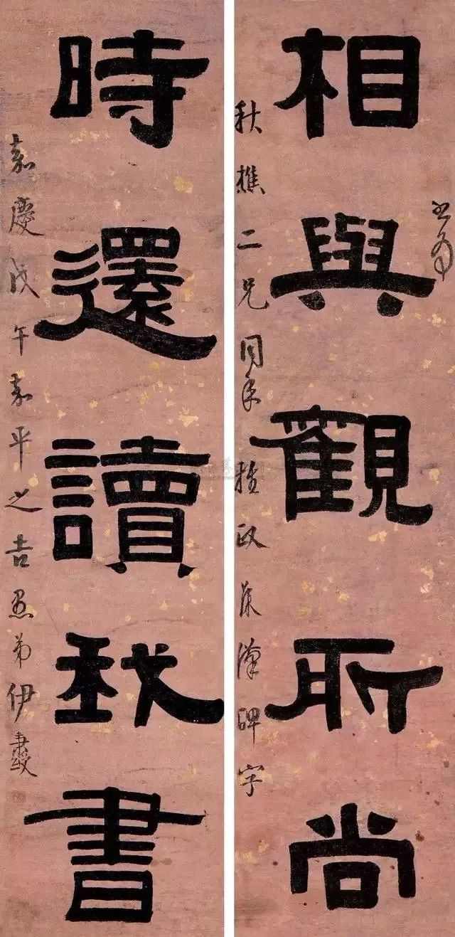 伊秉绶喜绘画、治印,亦有诗集传世。工书,尤精篆隶,精秀古媚。隶书尤放纵飘逸,自成高古博大气象,与邓石如并称大家。他的署名“绶”字,“綬”第三笔不写一点,用“受”字的宝盖点来代替。