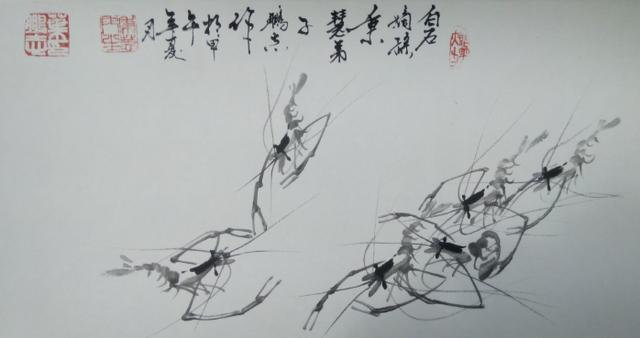 山水构图奇异不落旧俗,篆刻独出新意,书法卓然不群,可谓全才,所以齐白石被人们称为近代杰出的艺术大师。他的虾神态各异,游资舒畅自由,活泼生动、动态生息。两横浓墨便成眼睛,夸张得体,脑袋中间用重墨做虾头,左右二笔淡墨使虾的头部变化多端。躯壳的透明和虾的重量被这由深到浅墨色表现了出来。而虾的腰部,一笔一节,连续数笔,形成了虾腰节奏的由粗渐细。微妙的用笔变化,使虾的腰部呈现各种异态,有躬腰向前的,有直腰游荡的。也有弯腰爬行的。虾的尾部也是寥寥几笔,既有弹力,又有透明感。虾的一对前爪,由细而粗,数节之间直到两螯,形似钳子,有开有合。虾的触须用数条淡墨线画出。长须布置得当,其线条似柔实刚,似断实连,直中有曲,乱中有序,图中之虾似在水中嬉戏游动,触须也似随虾身晃动。此图充分表明白石的用墨用水功夫之精妙,他所表现出的虾体似乎总是水淋淋的,如同真的生活在水中,白白的宣纸便成了清澈的溪水。这大概就是白石笔下的虾为什么永远富有生命力的原因所在。