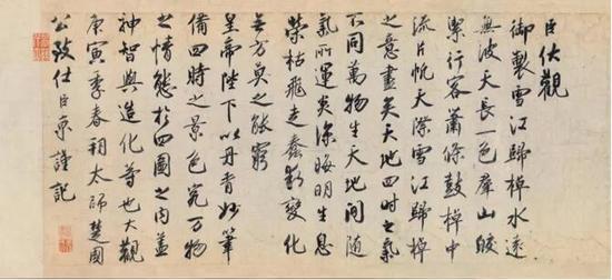 阅读宋元跋文应进入当时的语境。溥光说这件“布置宏远”的“巧密”之作是“丹青小景”,此系宋人尤其是北方画家对江南图景的称法,还有“江南画”等别称,如李唐在北宋所作的一幅江山全景之图,在当时即被定名为《江山小景图》卷(49.7厘米×186.7厘米,台北“故宫博物院”藏)。溥光自“志学之岁”(15岁)第一次“获观”是图,到书跋为止已经“百过”,很显然,该图起初不属于他,后来收入囊中,不然哪有百余次的观赏之便?按照佛教“四大皆空”的戒律,僧人不得炫耀财富,僧人圆寂后,其财产悉数归寺庙所有。所以僧人大多不在题跋里记录购买书画的细节和心情,尤其是像溥光这样的高僧,在他圆寂后,该图极可能归于大都某个寺庙,成为庙产。这意味着在相当长的时间里,该图难以在收藏领域里流通。也许这可以澄清此图在溥光之后300余年无收藏信息的背后原因。