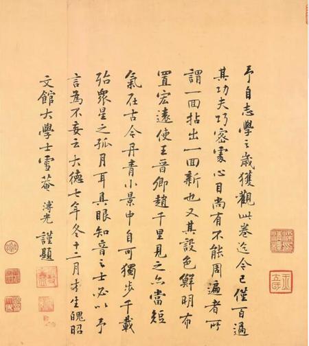 需要解释的是,溥光款署:“大德七年(1303)……昭文馆大学士雪庵溥光谨题”(图3),钤印“雪庵”(朱文)和“溥光”(白文),另有两个印痕似花押。清代黄本骥《跋溥光书万安寺茶榜》说他在“至大初(1308—1311)授昭文馆大学士”(苏显双查出刊于清吴荣光《辛丑消夏记》卷四),此乃虚职。据凌利中先生提示,溥光在传为唐代韩滉《丰稔图》卷(故宫博物院藏)后书有跋文(图4),经比对,其书写习惯和笔性书风实为一人,恰如明初陶宗仪《书史会要》卷七所云:“溥光小字亦有格力”。那么溥跋即为原始的第一手文献,清人黄本骥所录是传抄文献,会有误,溥光任职昭文馆大学士的时间也许要提前5年。