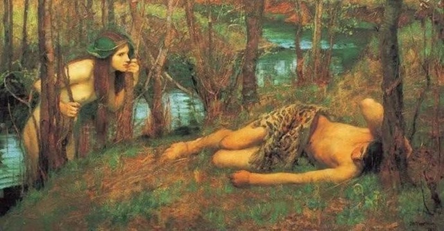 水之仙女刚刚上岸,她从树干的缝隙中窥看裹着豹皮的熟睡的青年。画面中几乎无处不在的红色和绿色的对比(俗称红配绿)被湖水反射出的蓝色减弱,并呈现出相当的协调。