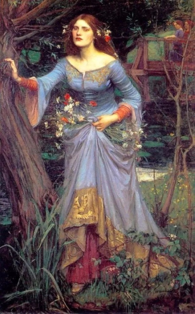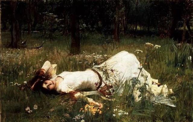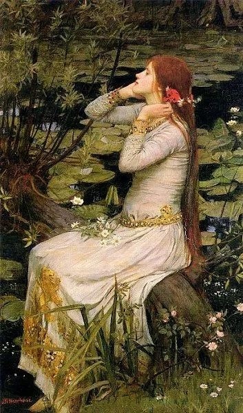 奥菲莉亚是莎士比亚创作的著名悲剧《哈姆雷特》中的一个人物,她躺在河岸草场上,眼神疯狂而绝望,一只手握着乱发,另一只手抓着一束花。