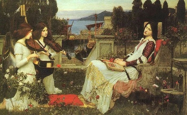 圣赛西莉娅生活在约公元前230年,她因发誓终身信仰基督教并保持贞节而闻名。圣赛西莉娅节是11月22日。沃特豪斯尝试用本图传达某种中世纪的感觉,而他也的确做到了。富有装饰性的画面,还有一点宗教画的味道。几乎没有现实主义和日常生活的痕迹。