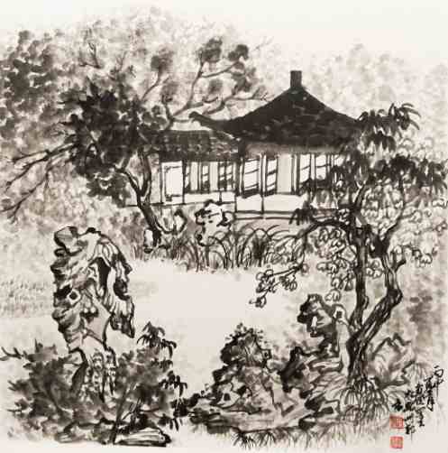 黄良俊《园林意趣系列之三》国画 45×45cm