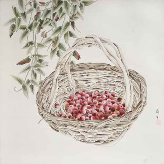 菊萍芳《叶绿桃红》国画 65×65cm