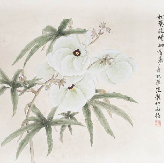 李振范《秋葵花开幽香来》国画 65×65cm