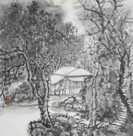 施金钟《幽林人家》国画 50×50cm