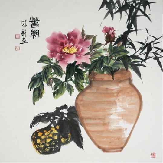 陶迎新《牡丹竹桔图》国画 68×68cm