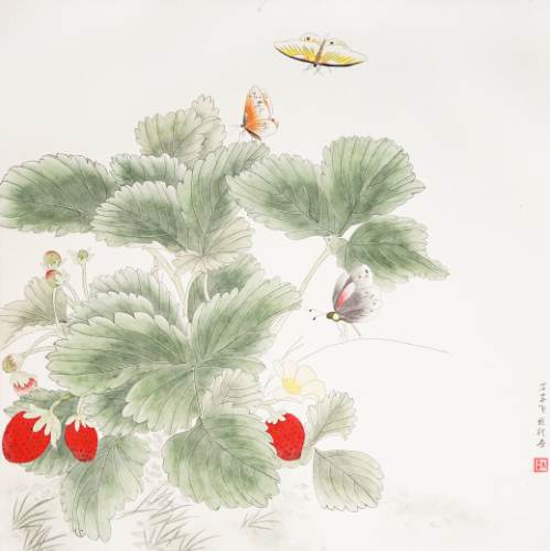 吴桂龙《蝴蝶草莓图》国画 65×65cm
