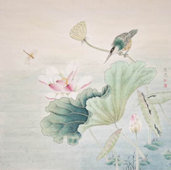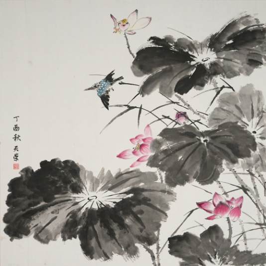 张天荣《荷花小鸟图》国画 68×68cm