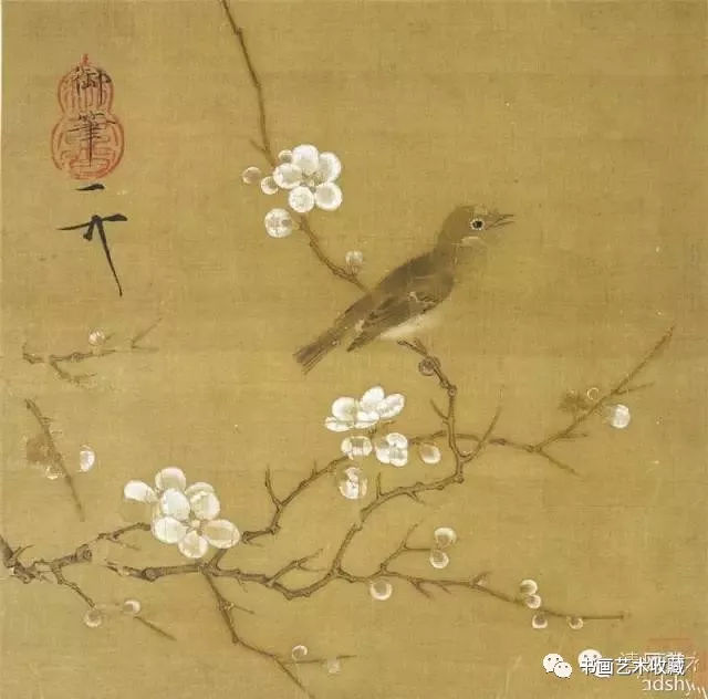 图中梅枝瘦劲,枝上疏花秀蕊,一只绣眼俏立枝头,鸣叫顾盼,与清丽的梅花相映成趣。此图虽景物不多,却颇优美动人。所绘梅花为宫梅,此种梅的画法精细纤巧,敷色厚重,自有一种富贵气息,这样的风格趣味为宫廷所好尚,显然代表了皇家的审美意味。