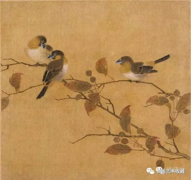 宋代是花鸟画的成熟和鼎盛时期,在应物象形、意境营造、笔墨技巧等方面都臻于完美。此图三只文鸟姿态各异,树枝一笔画出,用赭色构描叶脉与细枝。树叶、小果采用没骨画法。文鸟以中锋细笔丝出羽毛,用白粉、赭石、浓淡墨轻染,真实细腻,高度写实。构图疏朗,动静结合。