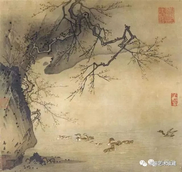 峭壁之上,两株梅树一上一下,红白相映,错落而开。红梅枝干虬曲,取苍龙探海之势,这是马远画树的典型画法,人称“拖枝马远”。下方的野鸭既起到了平衡画面的作用,又是全图的点睛之笔,一幅“春江水暖鸭先知”的景象,无限生趣,跃然绢素。台北故宫博物院藏。