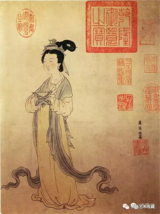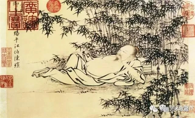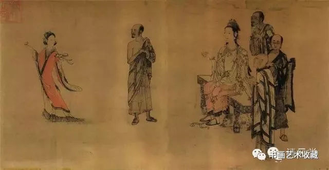 此图中天女手捧花蓝,边舞边散,对面菩萨神情安逸,微笑观看,周围几位罗汉则已被天女的舞姿所吸引,面露欣赏之色。刘松年,“南宋四大家”之一,师承李唐,画风笔精墨妙,清丽严谨,设色典雅,界画工致。所画人物神态生动,衣褶清劲,精妙入微。