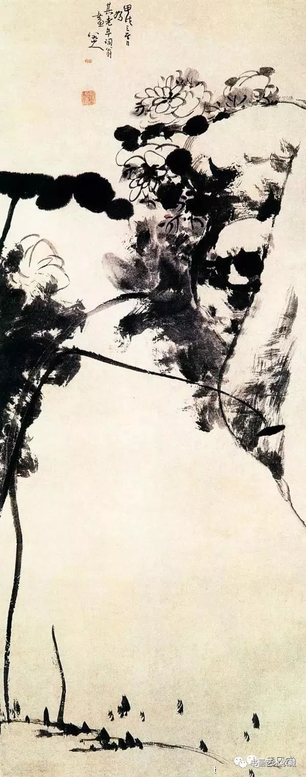 画之左侧伸出几片荷叶,大笔重捺,或泼墨大写,荷茎圆转苍劲,曲折舒张,荷花轻柔婉转,与之相对写一倒悬危石,只略加勾皴,石顶一丛芙蓉,墨韵盎然。荷石在上相接,下方留白,中似无物却有空潆幽远之意。整幅画墨气纵横,用笔似游龙盘旋,充分体现了八大山人的绘画特点。