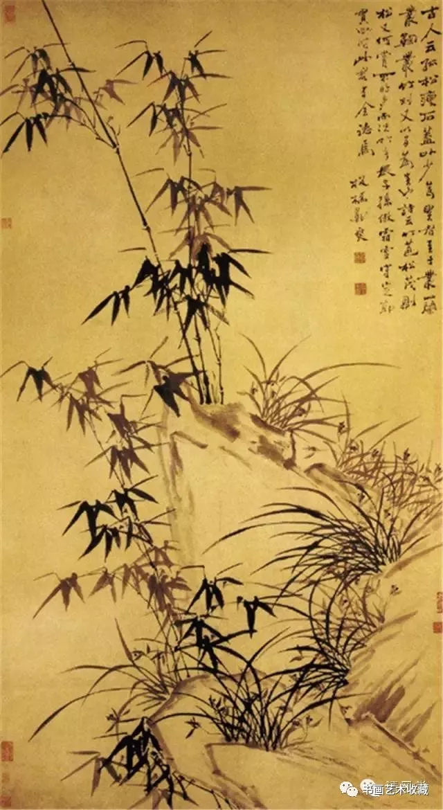 郑板桥此图画兰竹与石,用笔遒健圆劲,极疏爽飞动之致。石用中锋勾勒,笔致瘦硬秀拔,皴擦较少,而神韵具足,竹用浓笔,石用淡墨,浓淡相映,妙趣横生。总观全图,气势俊迈,风神萧散,傲然挺立。