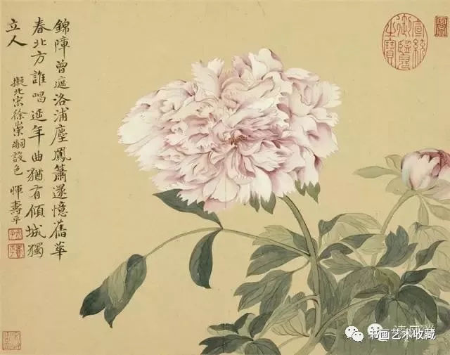 此幅写折枝牡丹,一支盛开艳放,一支初吐芳华,清姿艳态,娇美动人。花朵以淡墨勾描,以丹、铅二色晕染,写实生动。辅以深浅绿叶,以浓墨勾筋,线条圆润饱满,叶片清秀洒脱,疏密有致,为其花卉写生佳品之作。