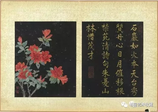本幅黑底彩绘杜鹃花,红绿交映,对幅金书,显得富贵喜气。虽然用色鲜艳饱和,但因衬以少见的深色背景,反而使画面沉静平稳,益发显得花色照人眼明。花瓣筋络与叶脉勾画仔细,花朵从瓣缘至花心用色渐深以营造立体感,可见画家对自然的入微观察。台北故宫藏。