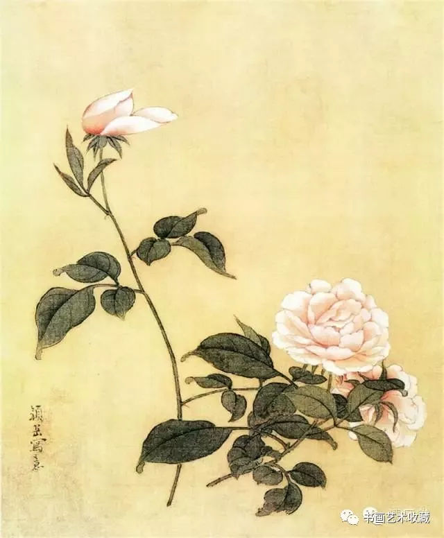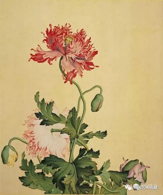 以灵活的线条,表现花瓣茎叶的柔软质感,与受到微风吹拂翻转的立体态势,并以色彩深浅变化,暗示日照花开的光泽与奕奕生机。花苞饱满的量感与纤毫备至的叶瓣脉络,均展现了浓厚西洋光影透视技法的写实功力。