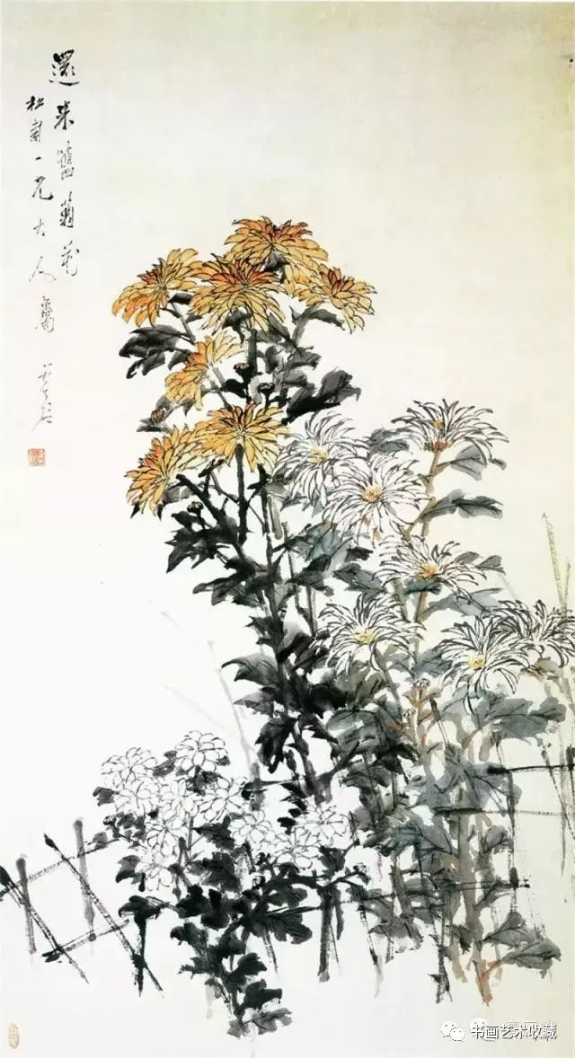 此画中斜写黄白菊花于矮篱前绽放争秋。笔墨出神入化,侧峰逆运,淡彩焦墨,笔笔送到。黄菊枝叶以水墨晕写,而白菊却以青叶相衬,杆加赭色。两菊虽枝叶交杂,却密而不乱,层次分明。干笔疾劲,勾出矮篱,白花矮丛使画面稳定平衡。背景虽无它物,却充满空寥寂静之意。