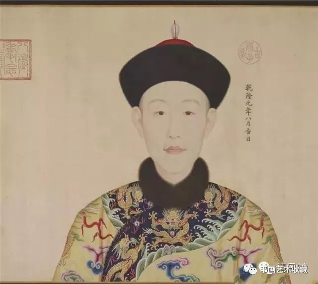 乾隆帝即清高宗纯皇帝,姓爱新觉罗,讳弘历,是雍正帝第四子。其头戴冬吉服冠,红缨顶,海龙皮帽,冠顶衔大珍珠一颗;身着明黄色龙袍,领袖边供为石青缎绣五彩云金龙,加海龙皮领,画面上乾隆面目清秀,神采奕奕,风华正茂。从绘画技巧及设色风格着眼出自宫廷画师郎世宁之手笔。