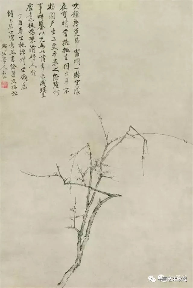 此幅墨梅图虽简率,但见功力,有代表性。为清顺治十四年(丁酉),即1657年春做,时年48岁。此画给人以清新的感受。弘仁最爱画松树、梅花。他曾自号“梅花古衲”,并遗命友人于其墓侧多种梅。