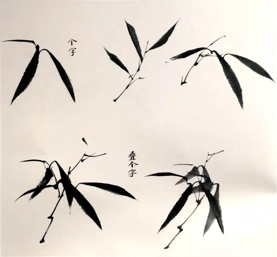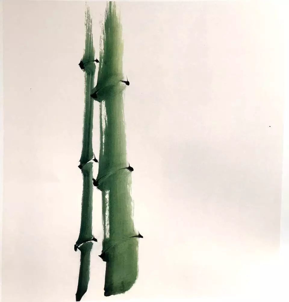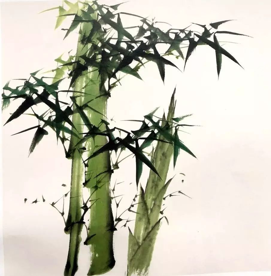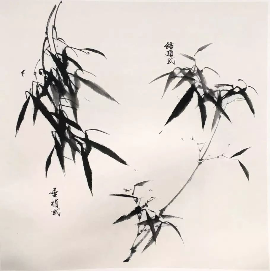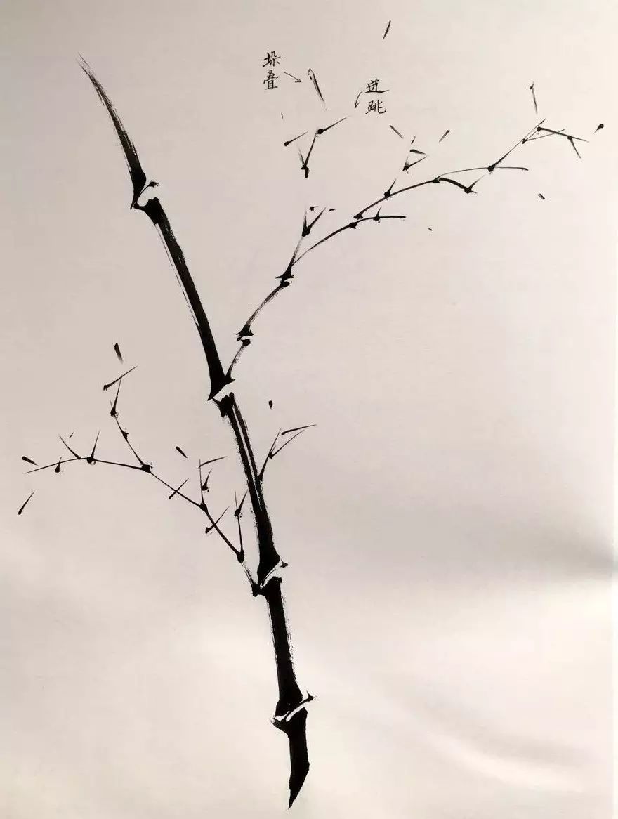画竹先立竿,一竿之出基本决定了画面的布局,粗竿多用淡墨,用笔要挺拨,一竿直上干净利落,不可呆滞停顿。先出主竿控制好画面,再用稍微浓点的墨画出分枝,小枝能决定竹叶的位置,虽然很多小枝稍最后盖都被竹叶所覆盖,但是出小枝也不能马虎。竹叶的表现多以“个”“介”字为基础,运用这个程式不能过分刻板,既要有排列,也要有长短变化进行打破,这样一组叶子才能生动。