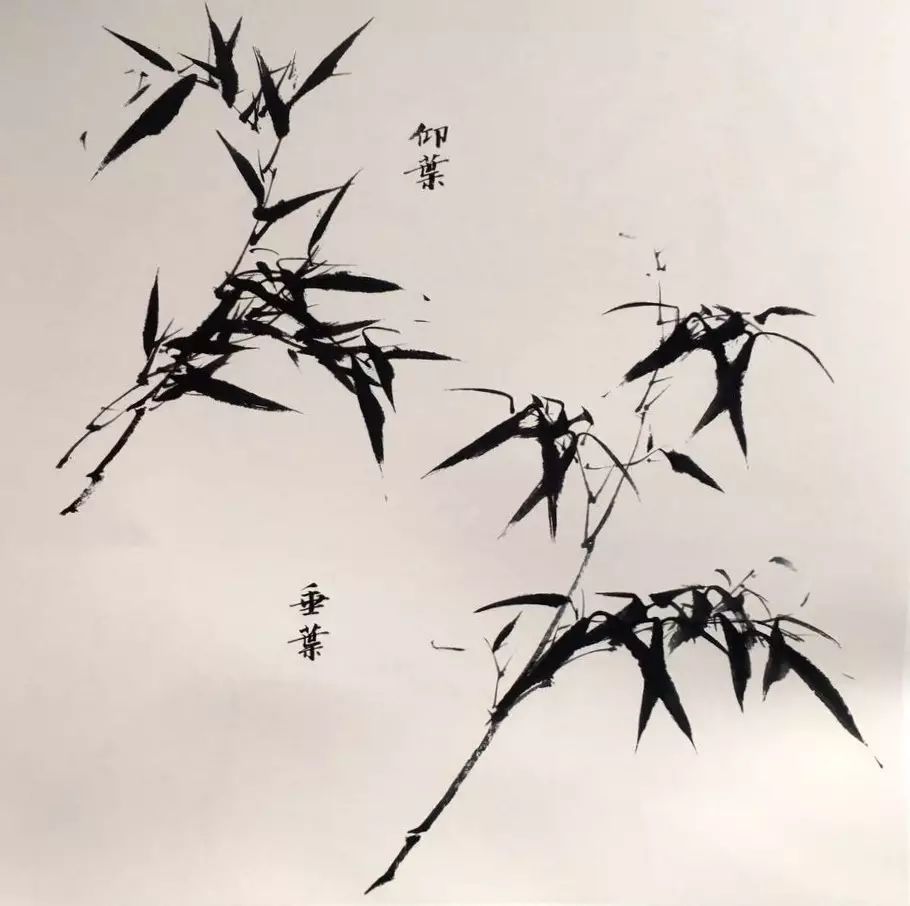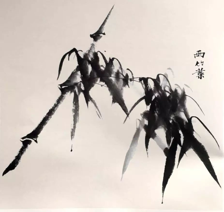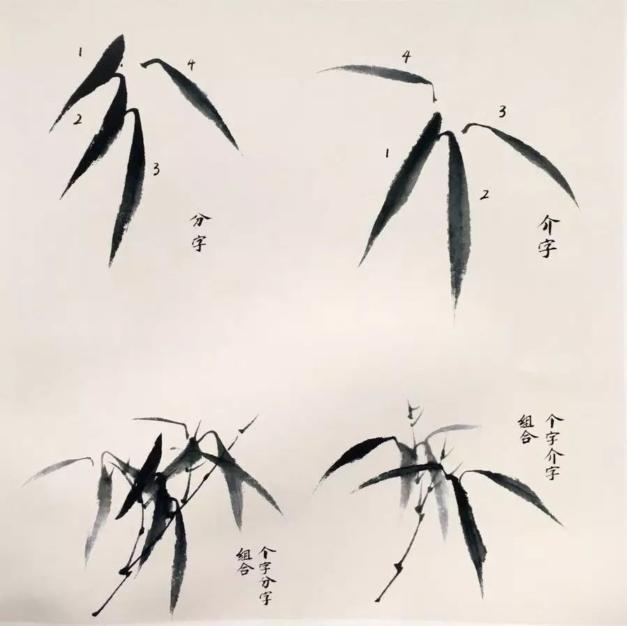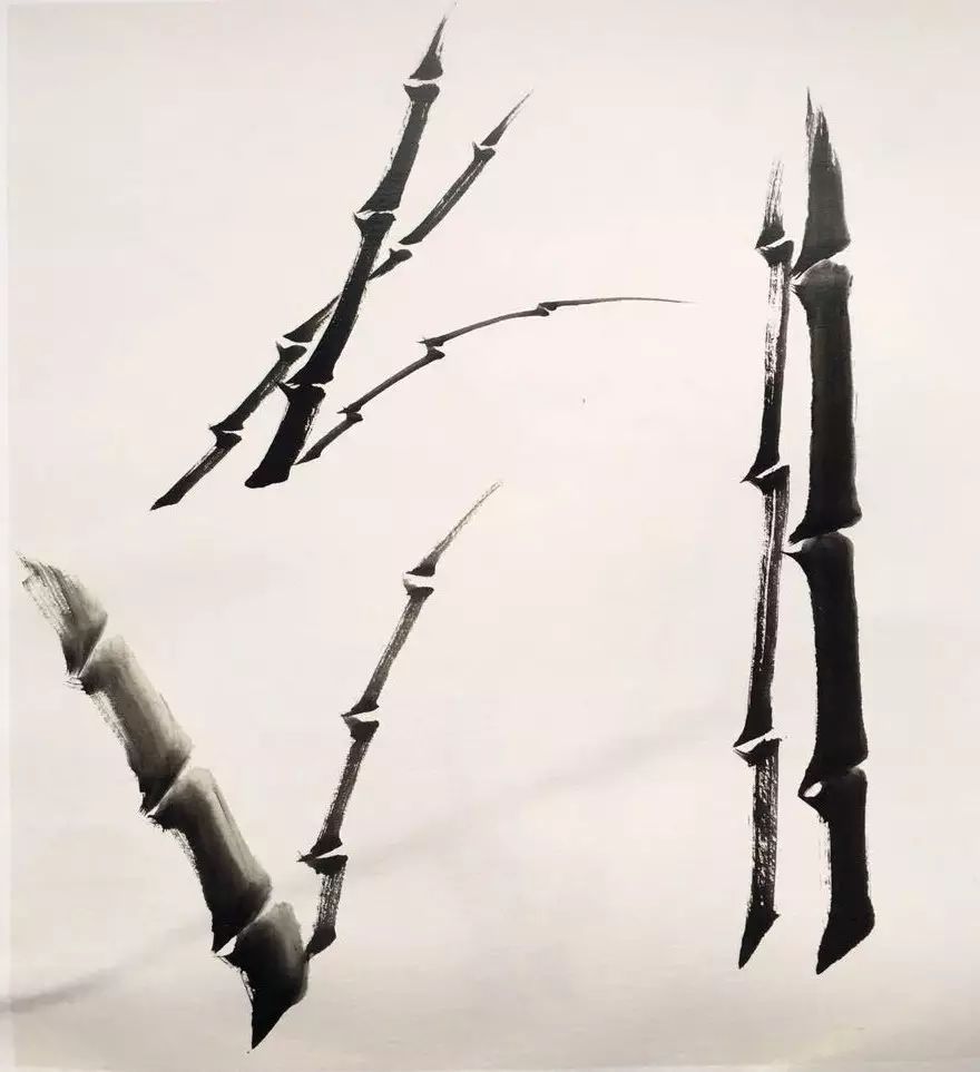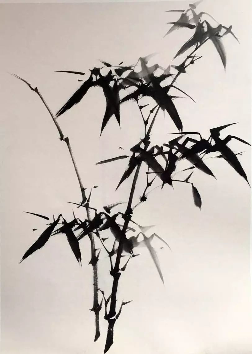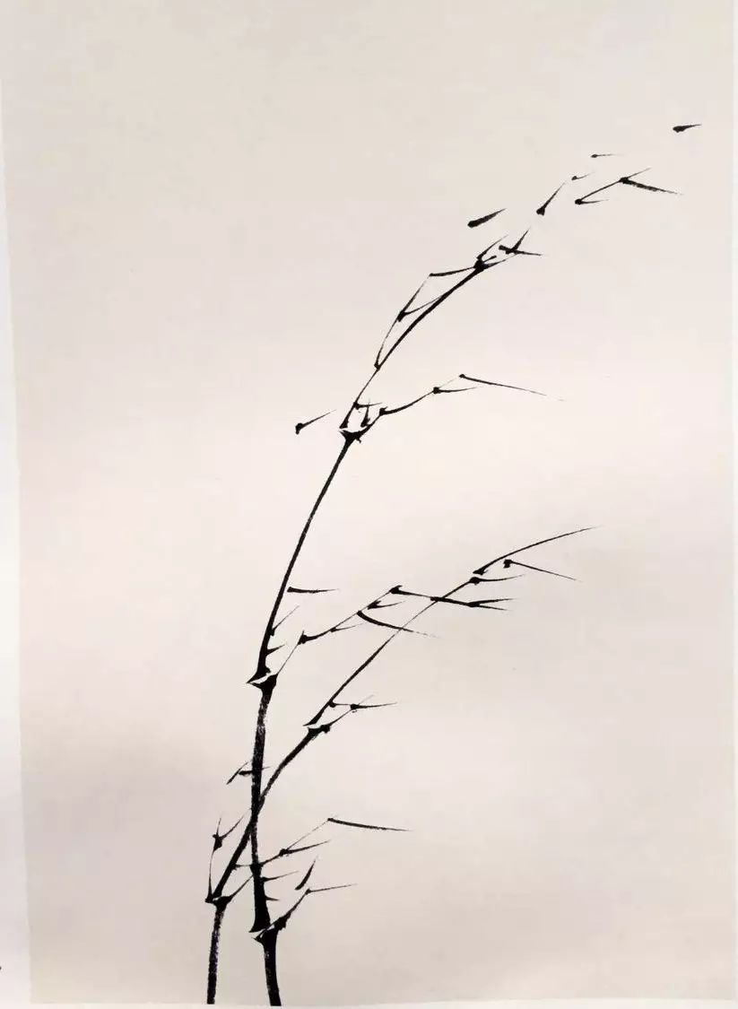 画竹先立竿,一竿之出基本决定了画面的布局,粗竿多用淡墨,用笔要挺拨,一竿直上干净利落,不可呆滞停顿。先出主竿控制好画面,再用稍微浓点的墨画出分枝,小枝能决定竹叶的位置,虽然很多小枝稍最后盖都被竹叶所覆盖,但是出小枝也不能马虎。竹叶的表现多以“个”“介”字为基础,运用这个程式不能过分刻板,既要有排列,也要有长短变化进行打破,这样一组叶子才能生动。