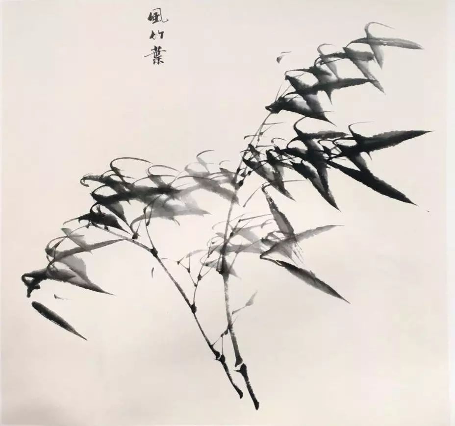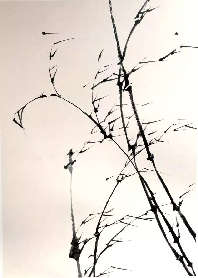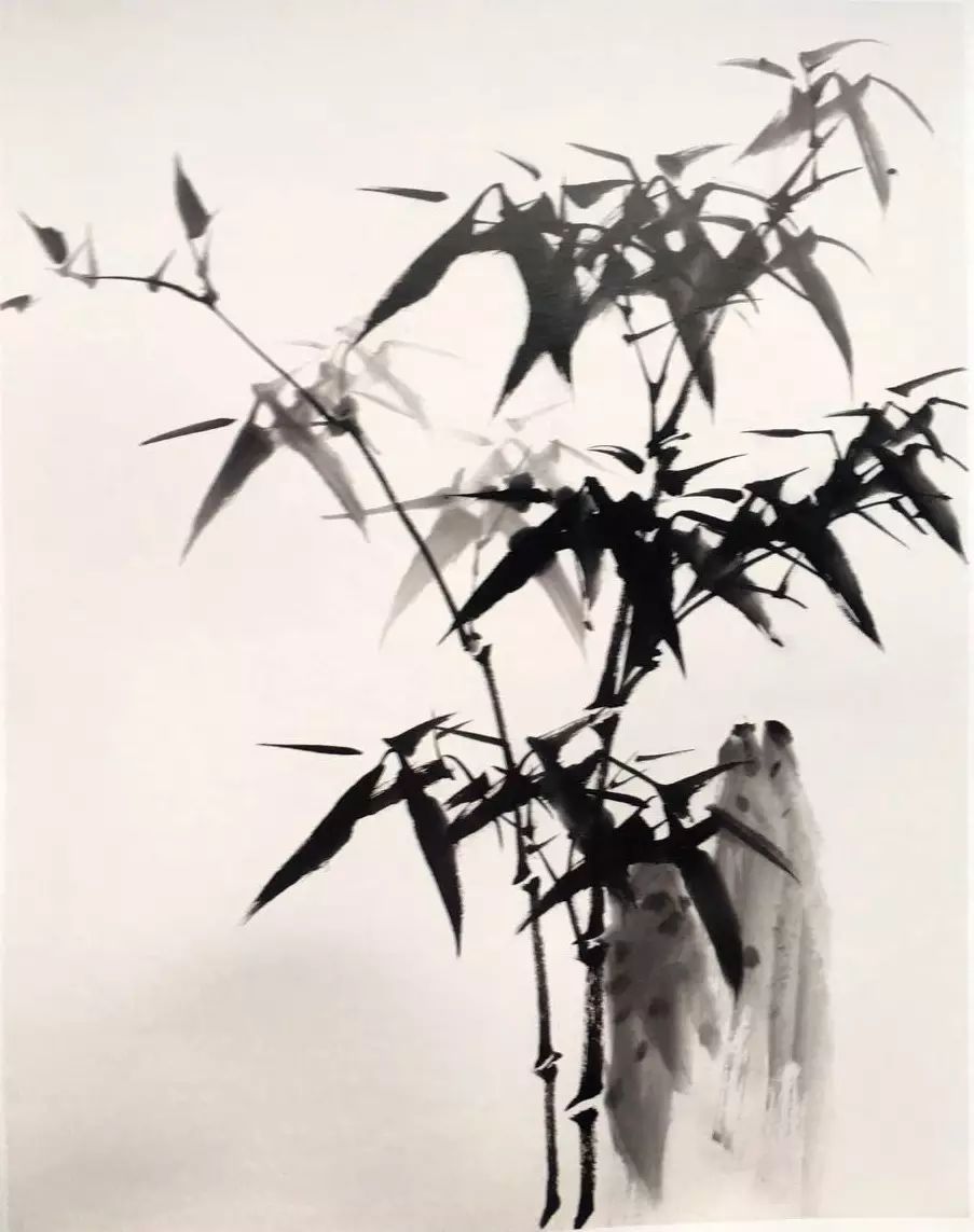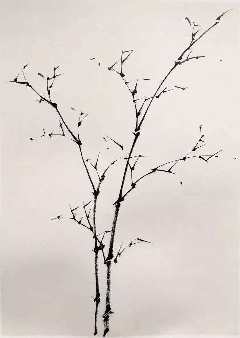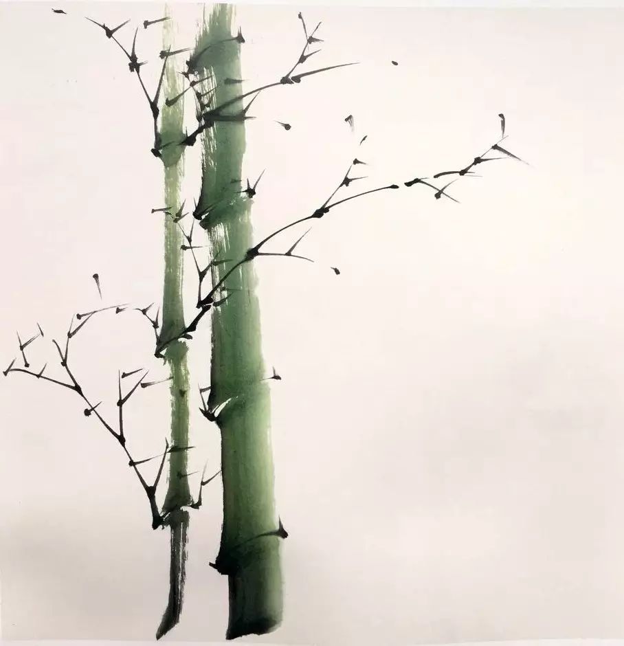 画竹先立竿,一竿之出基本决定了画面的布局,粗竿多用淡墨,用笔要挺拨,一竿直上干净利落,不可呆滞停顿。先出主竿控制好画面,再用稍微浓点的墨画出分枝,小枝能决定竹叶的位置,虽然很多小枝稍最后盖都被竹叶所覆盖,但是出小枝也不能马虎。竹叶的表现多以“个”“介”字为基础,运用这个程式不能过分刻板,既要有排列,也要有长短变化进行打破,这样一组叶子才能生动。
