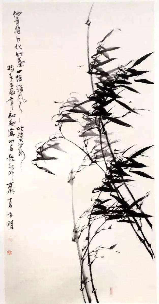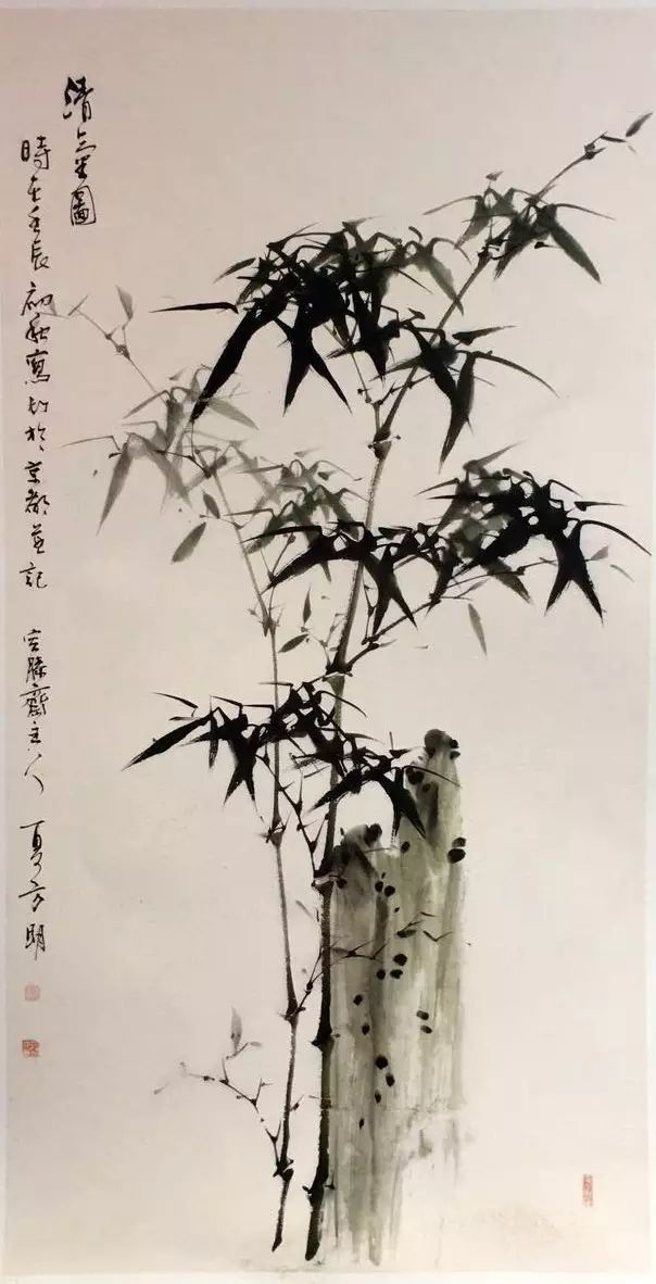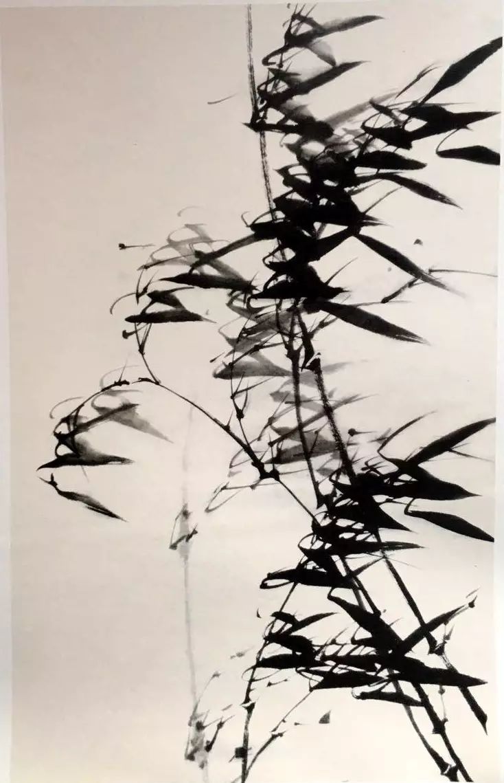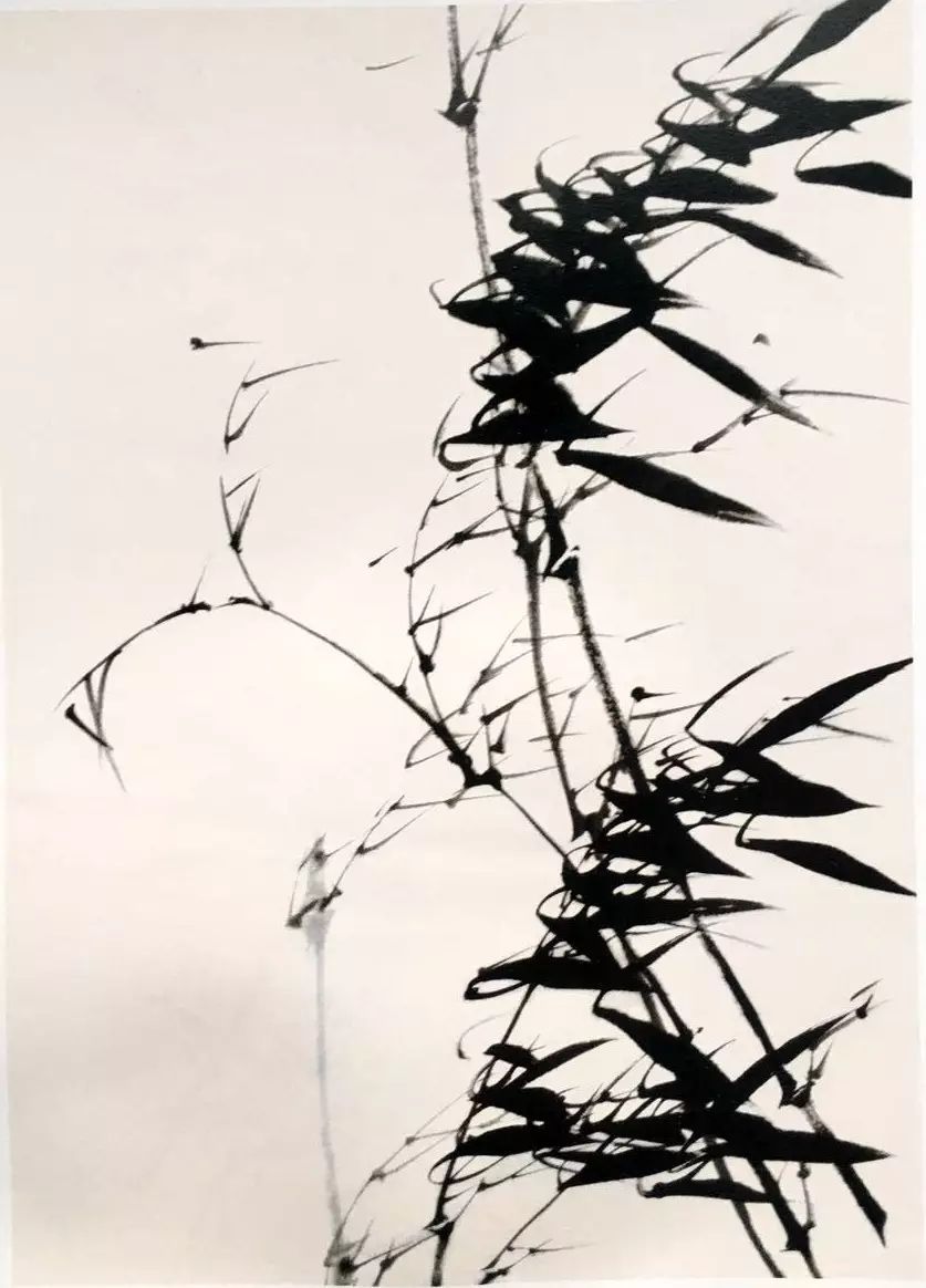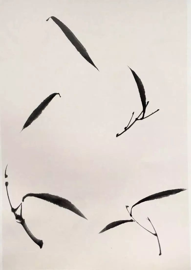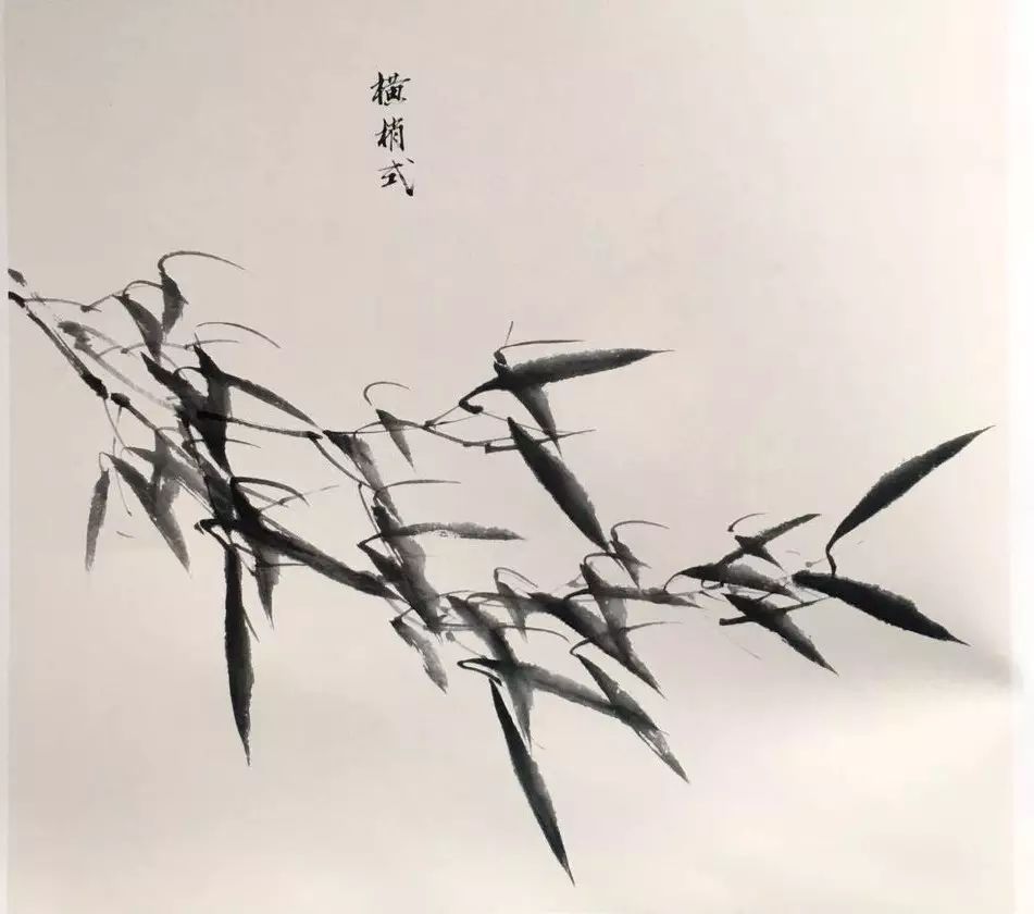 画竹先立竿,一竿之出基本决定了画面的布局,粗竿多用淡墨,用笔要挺拨,一竿直上干净利落,不可呆滞停顿。先出主竿控制好画面,再用稍微浓点的墨画出分枝,小枝能决定竹叶的位置,虽然很多小枝稍最后盖都被竹叶所覆盖,但是出小枝也不能马虎。竹叶的表现多以“个”“介”字为基础,运用这个程式不能过分刻板,既要有排列,也要有长短变化进行打破,这样一组叶子才能生动。