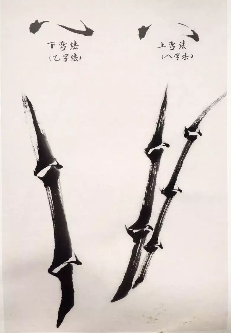 画节法古人分类归结起来,不外乎“上弯型”与“下弯型”两类,亦古人所讲八字法与乙字法。作者在画2米以上高度的竹竿时多在竹竿顶部用上弯法,底部用下弯法,以符合透视规律。