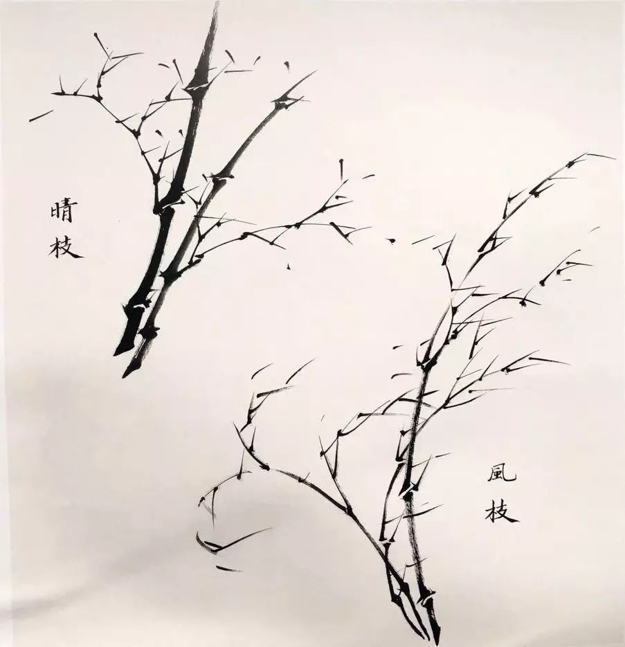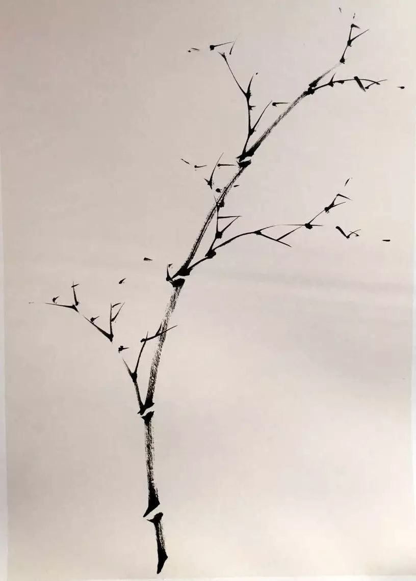 1、用狼毫笔由下而上画出主竿,由粗及细,至稍渐短,注意小枝之间的呼应。