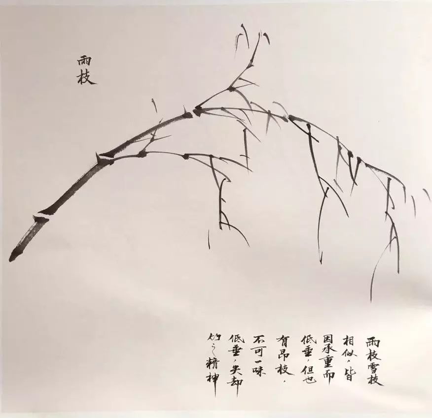 一般情况下,竿离地五节始生枝,竹枝为互生,画时须注意出枝的长度、方向。画枝要挺拔劲健,行笔要快,笔意连绵。枝上又生小枝,自内向外画的小枝,古人名之“迸跳”;自外向内画的小枝,古人名之“垛叠”。画时要兼而有之。竹节生枝不必节节出之,根据画面章法可省略。