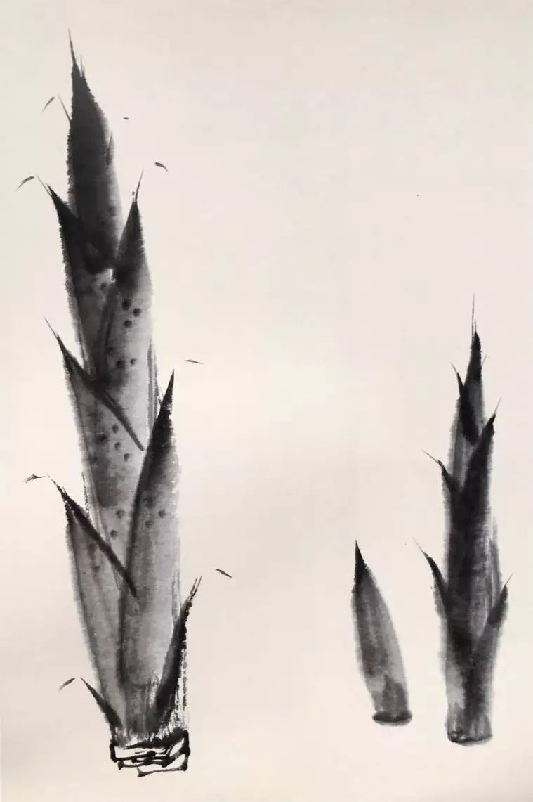 竹笋用笔要按箨片的结构,侧锋用笔,一左一右,交互写下来。所有竹笋的基本结构是一致的。笋中有节,节外有竹箨包着。由于竹子种类不同,其竹笋外部形状也各有不同。