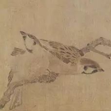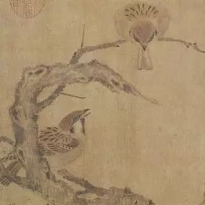 作品描绘隆冬的黄昏,一群麻雀在古木上安栖入寐的景象。作者在构图上把雀群分为三部分:左侧三雀,已经憩息安眠,处于静态;右侧二雀,乍来迟到,处于动态;而中间四雀,作为本幅重心,呼应上下左右,串联气脉,由动至静,使之浑然一体。树干在形骨轻秀的鸟雀衬托下,显得格外浑穆恬澹,苍寒野逸。此图树干的用笔落墨都很重,且烘、染、勾、皴,浑然不分,造型纯以墨法,笔踪难寻。虽施于画上的赭石都已褪落,但丝毫未损害它的神采,有师法徐熙的用笔特点。