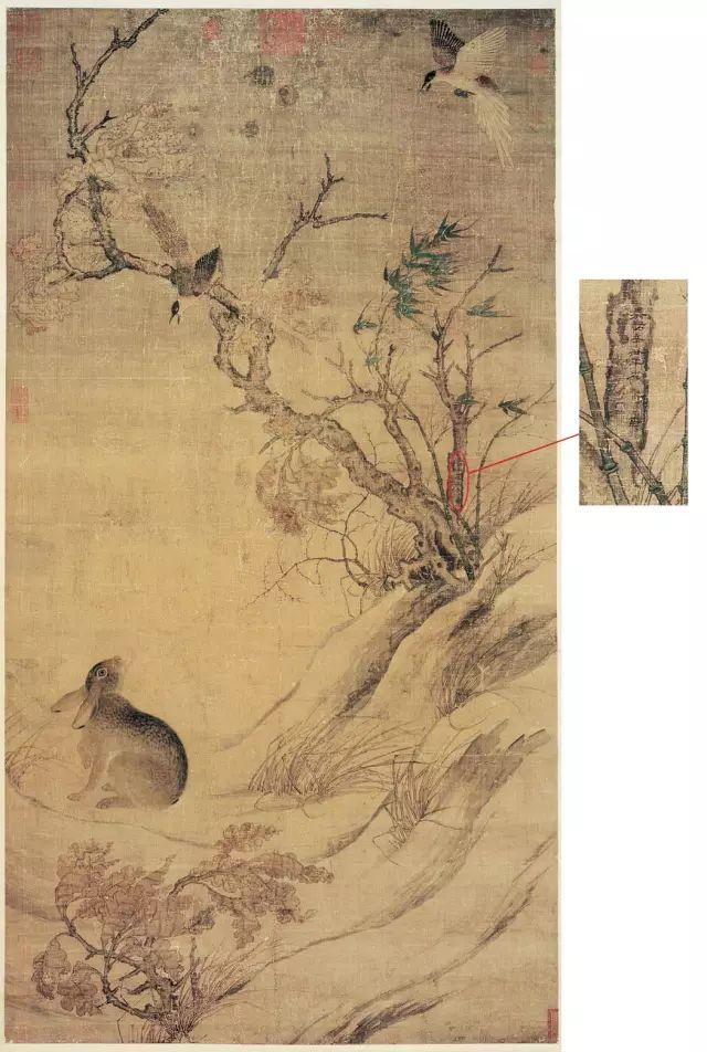 后人在画中树干上发现了“嘉祐辛丑年崔白笔”的题识,嘉祐辛丑是北宋仁宗嘉祐六年,正是公元1061年(宋仁宗1063年去世随后宋英宗即位但在1067年英年早逝)。 相传此画暗指嘉祐年间发生的一件宫廷丑闻,下嫁仁宗亲生母亲李宸妃亲眷李玮的福康公主与梁怀吉相对小酌被李玮之母发现,福康公主因不满婚配夜闯禁门请求与驸马仳离,却被群臣以家风不正之由处罚,福康公主精神失常,仁宗伤心不已。因而画面中野兔和山鹊同时表现出惊惶的神色,画面中描绘的也是枯黄的秋天,生命遭遇到凋谢的艰难时刻,万物萧条的景象,充满了动荡与不安。