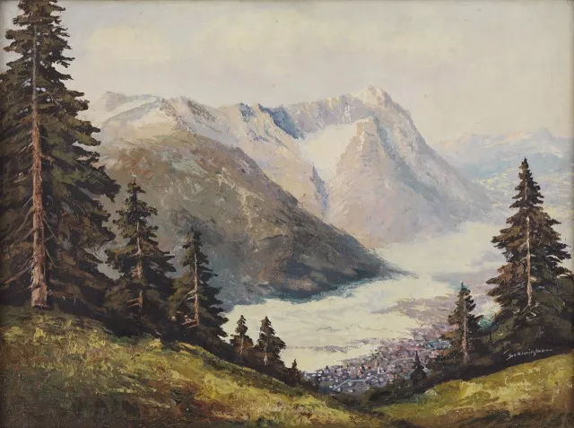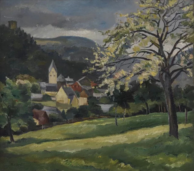 赫尔曼·施密茨·波恩(Hermann Schmitz-Bonn,1903-1960),曾就学于杜塞尔多夫学院师从马克斯·克拉伦巴赫。1939-1957年担任杜塞尔多夫“Malkasten”艺术家协会会员,活跃于杜塞尔多夫、埃菲尔等地。虽然同样注重研究光线与空气折射的表现,与老师克拉伦巴赫不同,波恩着重于山景的描绘,作品中近景、远景交错,交相辉映。