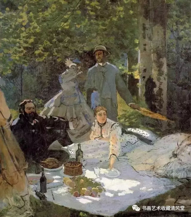 莫奈1865年的《草地上的午餐》,是向马奈1863年同名作致敬。他为了如实描绘光影效果,在地上挖了大坑,在坑内进行创作。本作虽然对人物有精确描绘,但真正出彩却是背景的树叶,它们在逆光下呈现出透明的绿色,由黄绿到深绿色彩层次极其丰富,莫奈解释说这画中每一片树叶对他来说都是模特的脸。